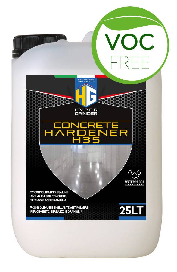 Treatment for concrete and cement surfaces in general, permanent, consolidating, hardening, and anti-salt. Concentrate formula with an high solid residue of Sodium Potassium Silicate. Dilute Concrete Hardener H35 with Demineralised Water or Distilled Water in the respective ratio 1:2. (In case of poorly absorbent substrates, a greater dilution is possible up to the ratio of 1:3 ). Ideal for indoor, outdoor, new or existing concrete or cement floors. Concrete Hardener is a high-performance SILICATE densifier that increase the hardness, the abrasion resistance and reduce dusting. Excellent for new and old concrete surface, Terrazzo and agglomerate floor. Extremely low in VOC’s (<30 grams per litre), leaves concrete hard and dust proof. It Penetrates deeply in the concrete, leaving no film to lift or peel off. Reduces efflorescence and surface sweating. Prolongs and improve finish of polished surfaces.