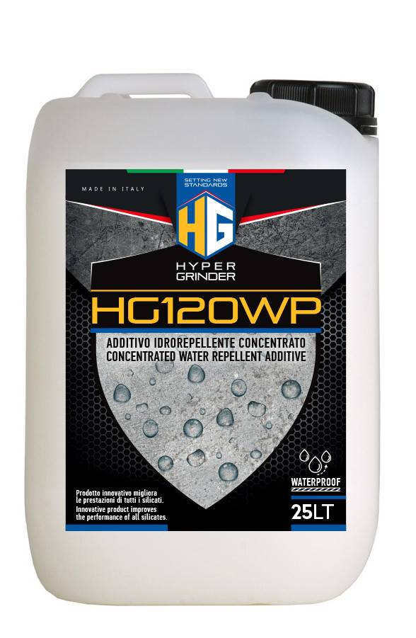 WATERPROOFING ADDITIVE CONCENTRATE FOR SILICATES. Hydrophobic agent in water, concentrated, colorless emulsion, capable of developing a high water repellent performance of concrete surfaces and absorbent mineral building materials. Added to 10% in silicates/consolidators Lithium or Sodium/Potassium base, besides the benefits that they perform, it makes the treated surfaces, water repellent with pearly effect. Particularly suitable for the “Concrete Hardener” line.